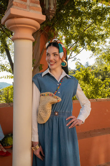 Casual meets chic in this sleeveless denim dress, designed with an elasticated waist for a flattering, comfortable fit. The lightweight denim fabric drapes beautifully, while the printed pattern on the shoulders adds a unique style. Perfect for warm days, it pairs easily with sneakers or sandals for an effortlessly stylish look.