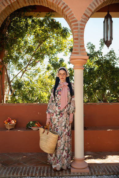 Soft florals meet striking detail in this loose-fit printed dress. The playful volume is balanced by a contrast necktie and coordinating cuffs, adding a refined edge to its relaxed shape. Ideal for both daytime elegance and evening gatherings.
