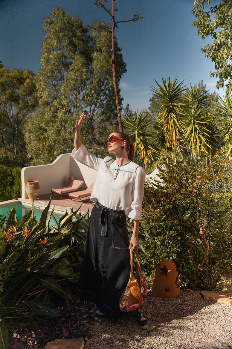 Light and elegant, this soft linen blouse is enhanced with delicate embroidery and color trimming for a refined finish. Breathable and beautifully textured, it’s perfect for relaxed days where comfort meets effortless sophistication.