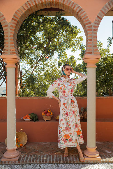 A boho-chic white maxi dress finished with vibrant multicolor floral print along the front, hem, sleeves, and collar. It features a collared neckline, long sleeves, and a self-tabric belt to cinch the waist, with decorative border piping for a handcrafted touch. Made in a lightweight, flowing fabric for all-day comfort, perfect for dressing up whilst staying comfortable.